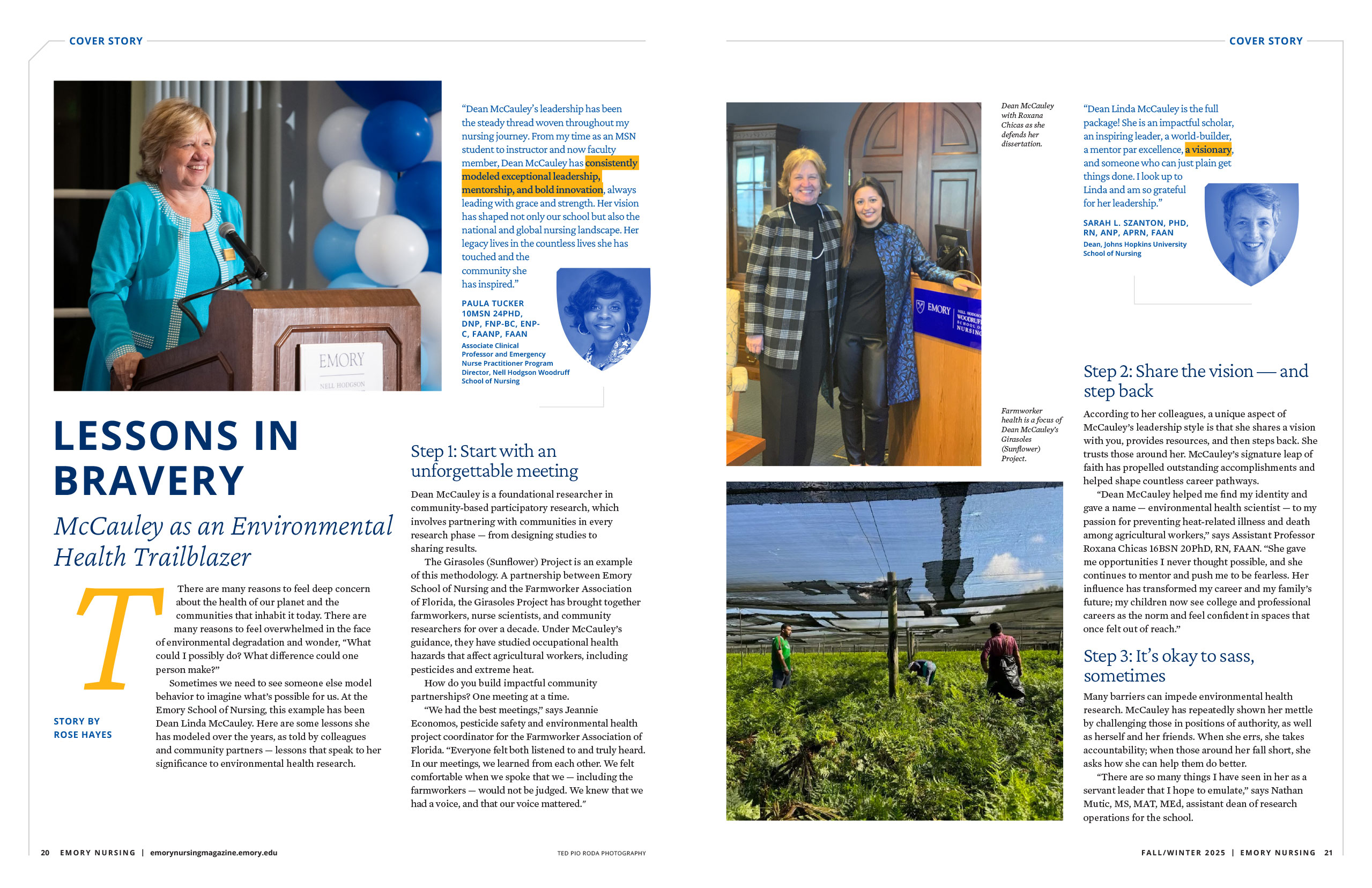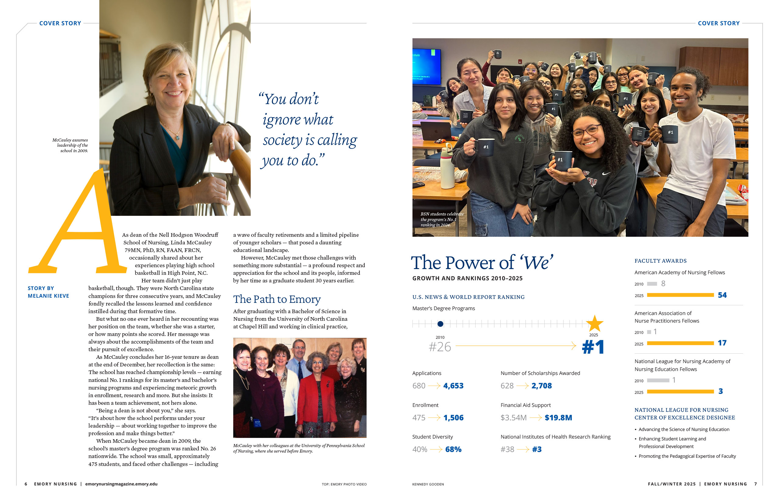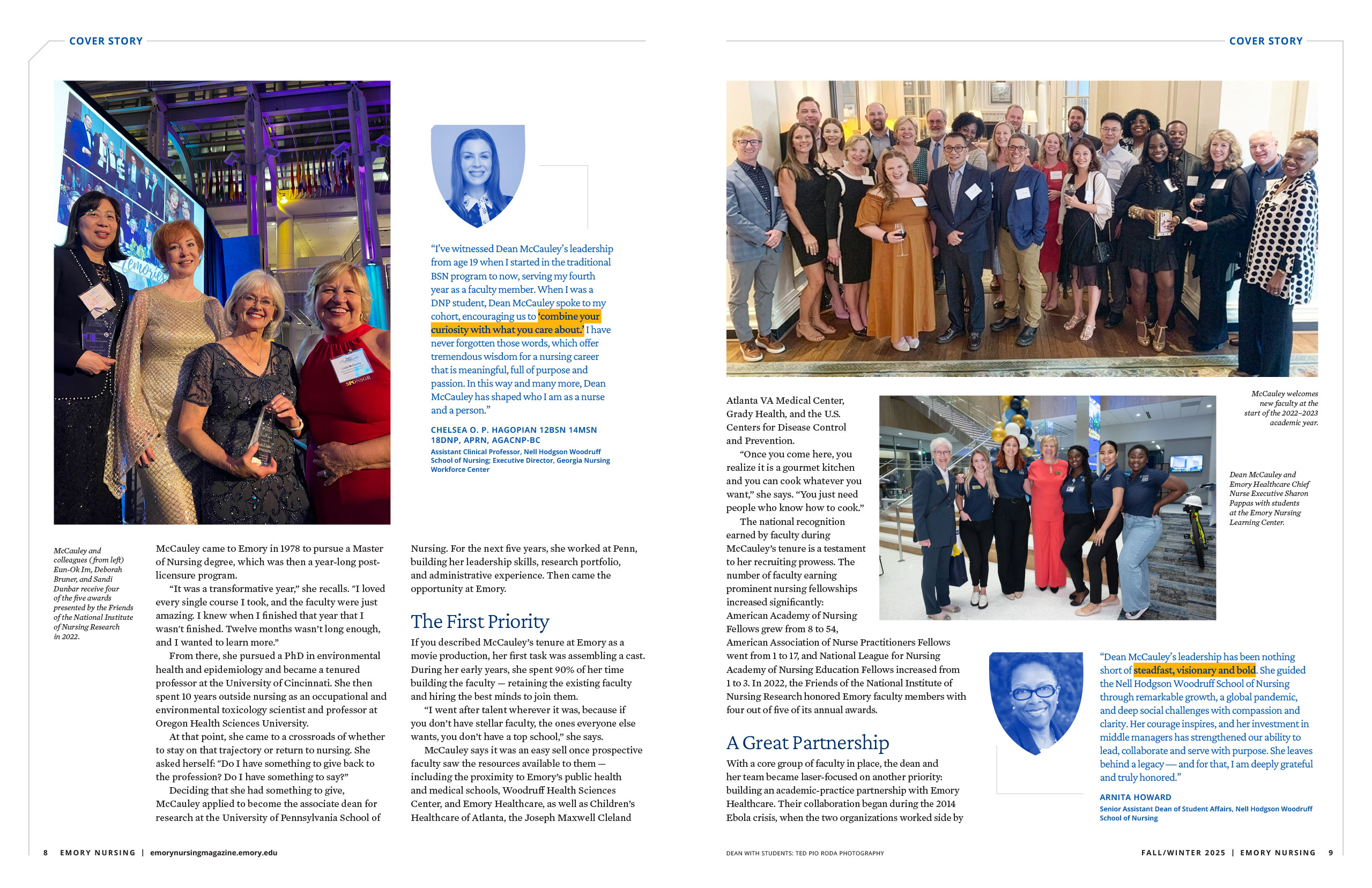 The Emory School of Nursing said goodbye to their longtime dean at the end of 2025. Her departure is a milestone in the school’s history and the communications team was determined to give her a beautiful and heartfelt send-off. Most of this issue was one giant feature, with a couple of secondary stories, that included dean’s quotes, short stories about her inspirational tenure, and data design. It was a complex project to put all the pieces together in a 36-page issue, based on a handful of text documents and a enormous folder of photos of the dean over 15 years. This was a fantastic challenge of organization and design consistency, and I’m grateful for clients who trust me with this type of in-depth detail work.