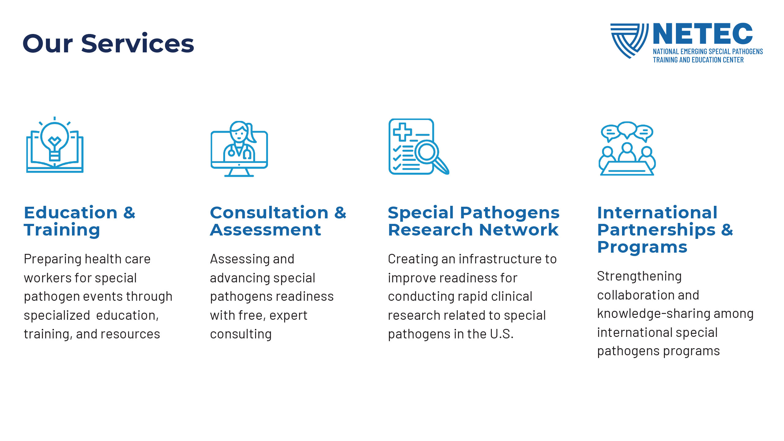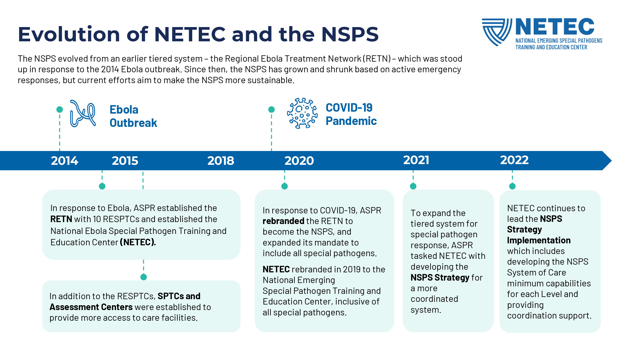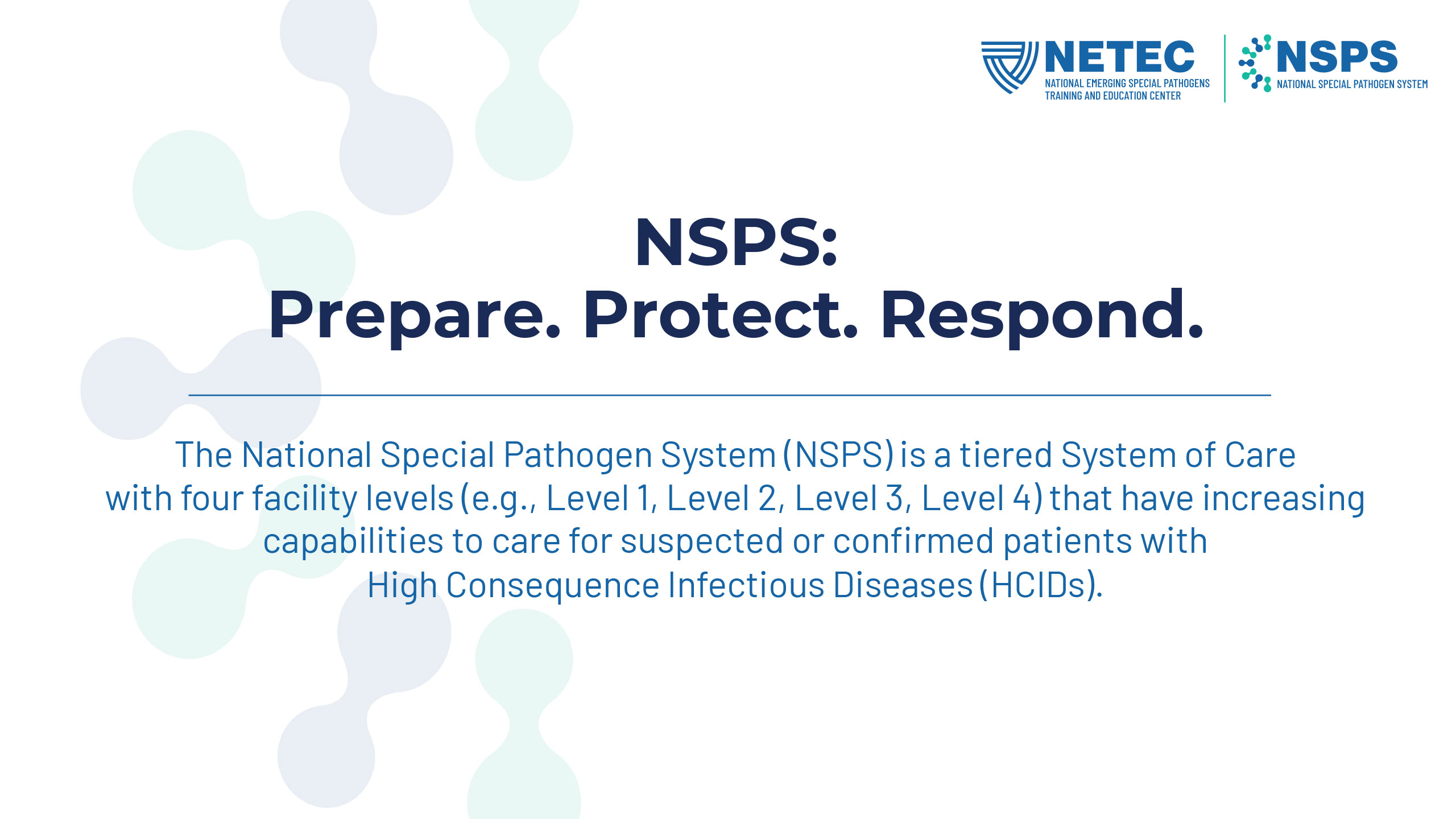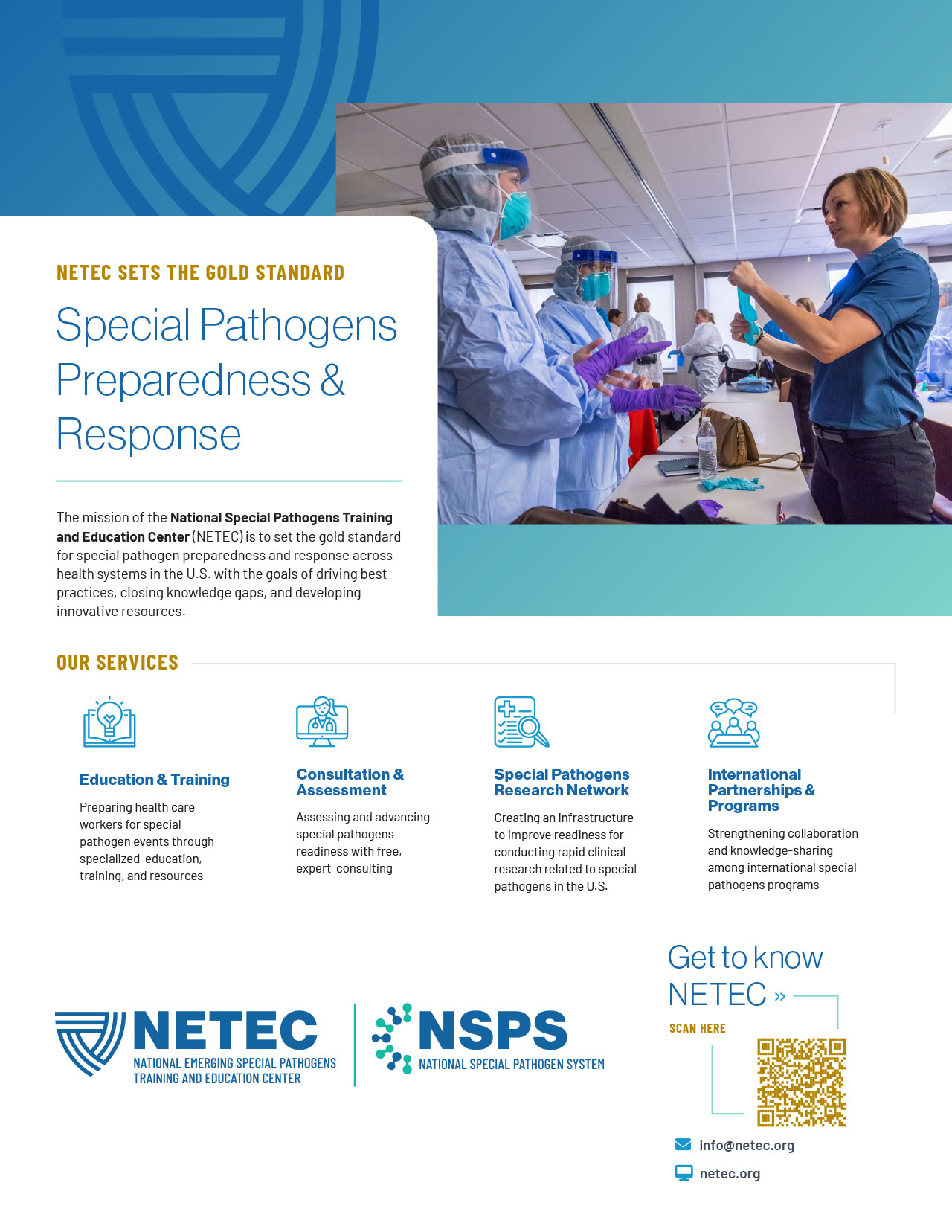 NETEC, the National Emerging Special Pathogens Training and Education Center, has a solid brand with a longstanding mark and quite a lot of equity in its main brand color, but needed to have a typography refresh, a secondary color buildout, and a new set of lockups for the NSPS (National Special Pathogen System) sub-brand. After all of this new branding was established, I updated their flyer and powerpoint templates.