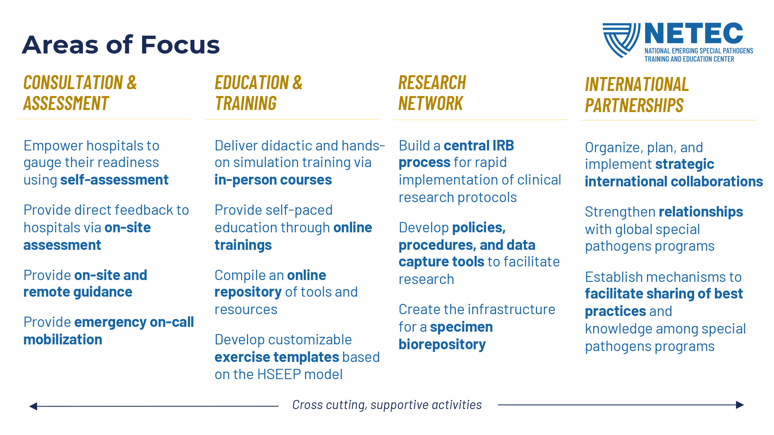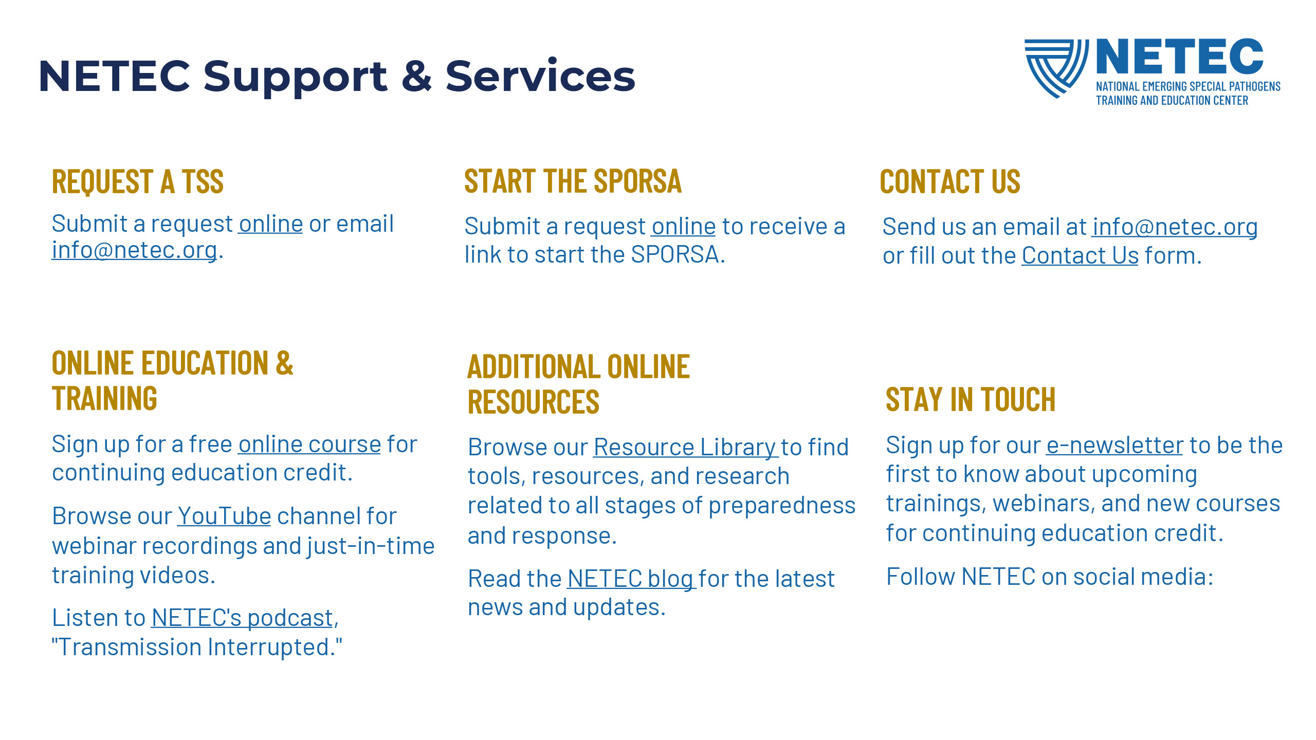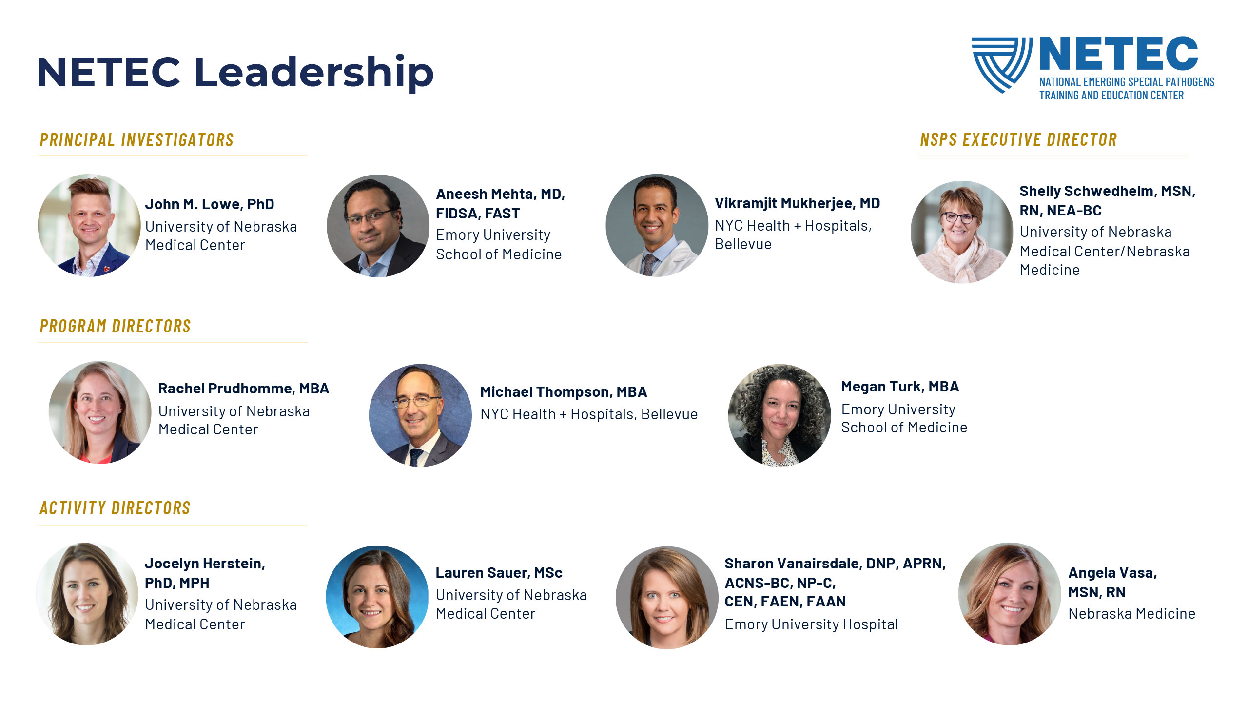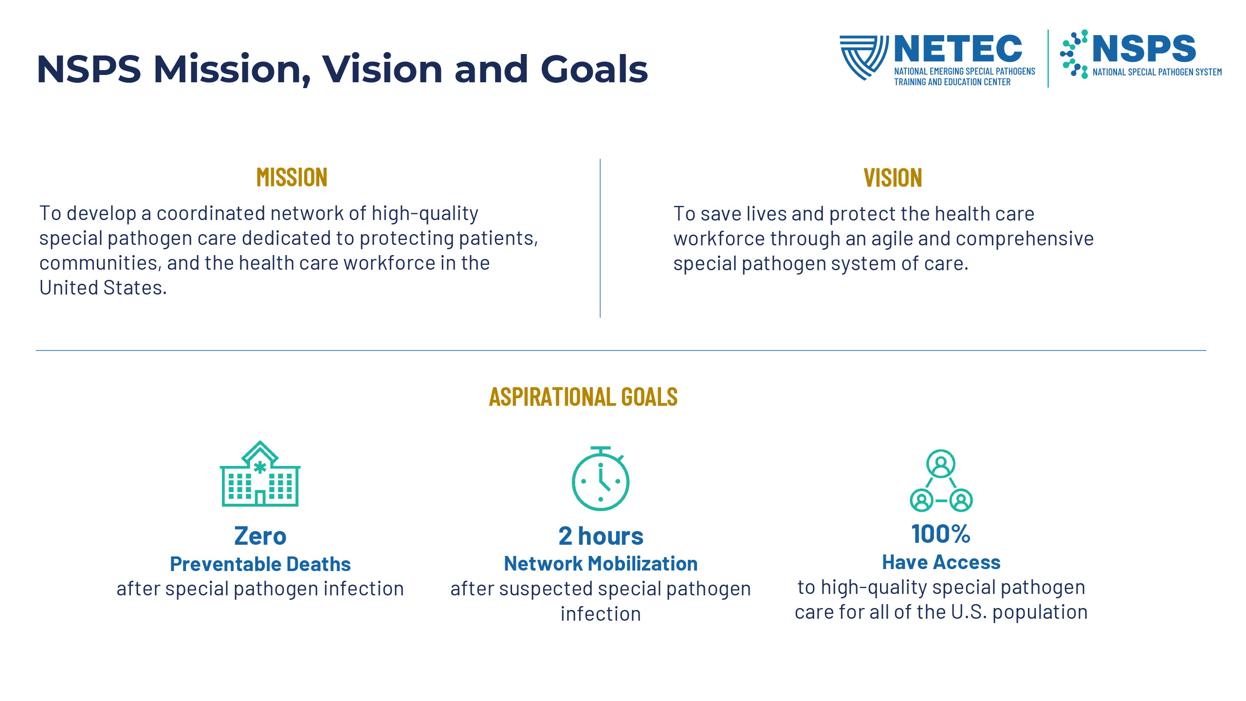 NETEC, the National Emerging Special Pathogens Training and Education Center, has a solid brand with a longstanding mark and quite a lot of equity in its main brand color, but needed to have a typography refresh, a secondary color buildout, and a new set of lockups for the NSPS (National Special Pathogen System) sub-brand. After all of this new branding was established, I updated their flyer and powerpoint templates.