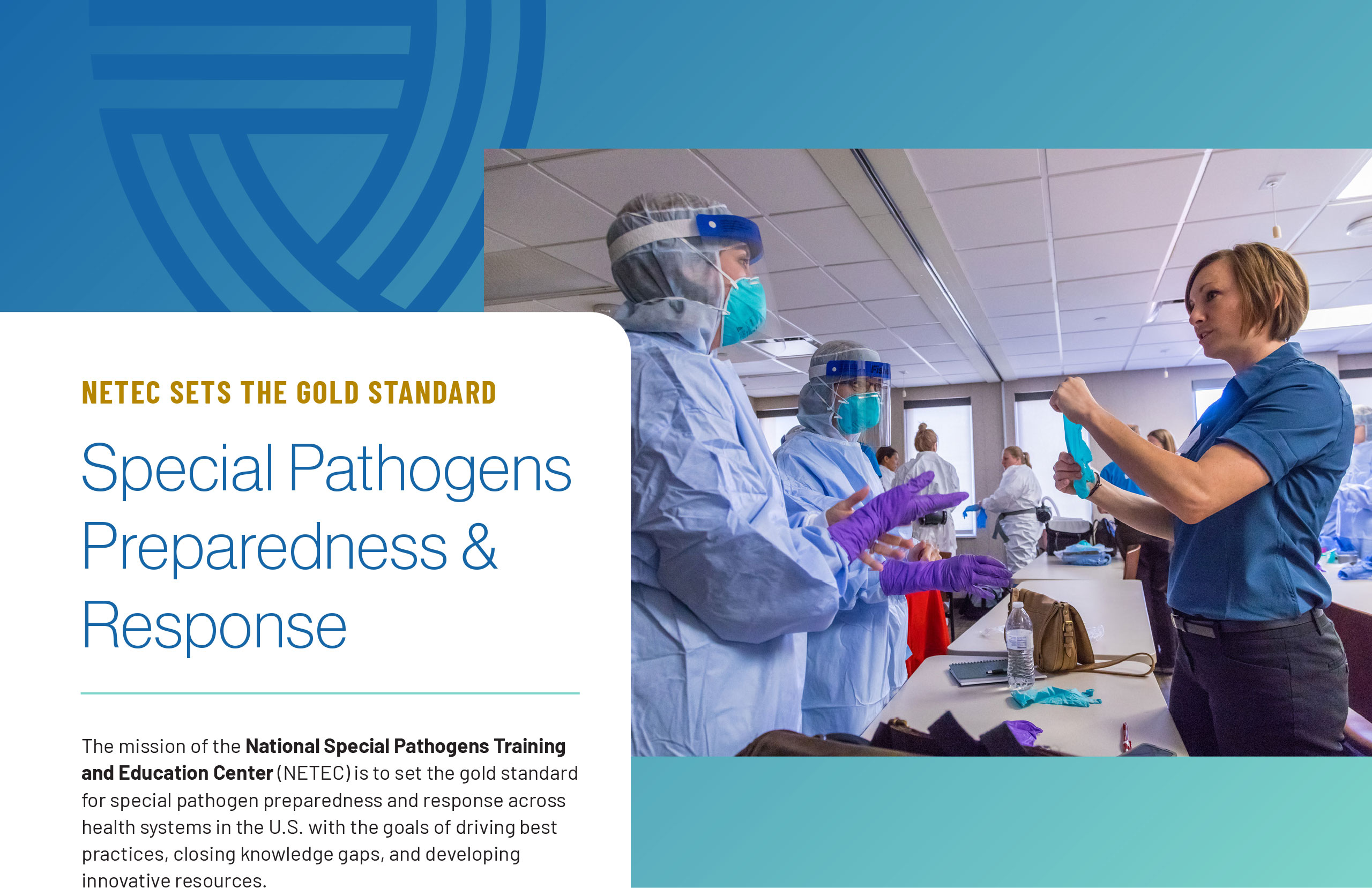 NETEC, the National Emerging Special Pathogens Training and Education Center, has a solid brand with a longstanding mark and quite a lot of equity in its main brand color, but needed to have a typography refresh, a secondary color buildout, and a new set of lockups for the NSPS (National Special Pathogen System) sub-brand. After all of this new branding was established, I updated their flyer and powerpoint templates.